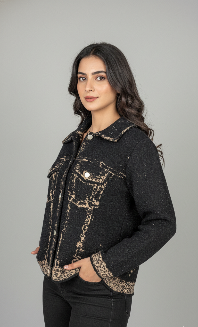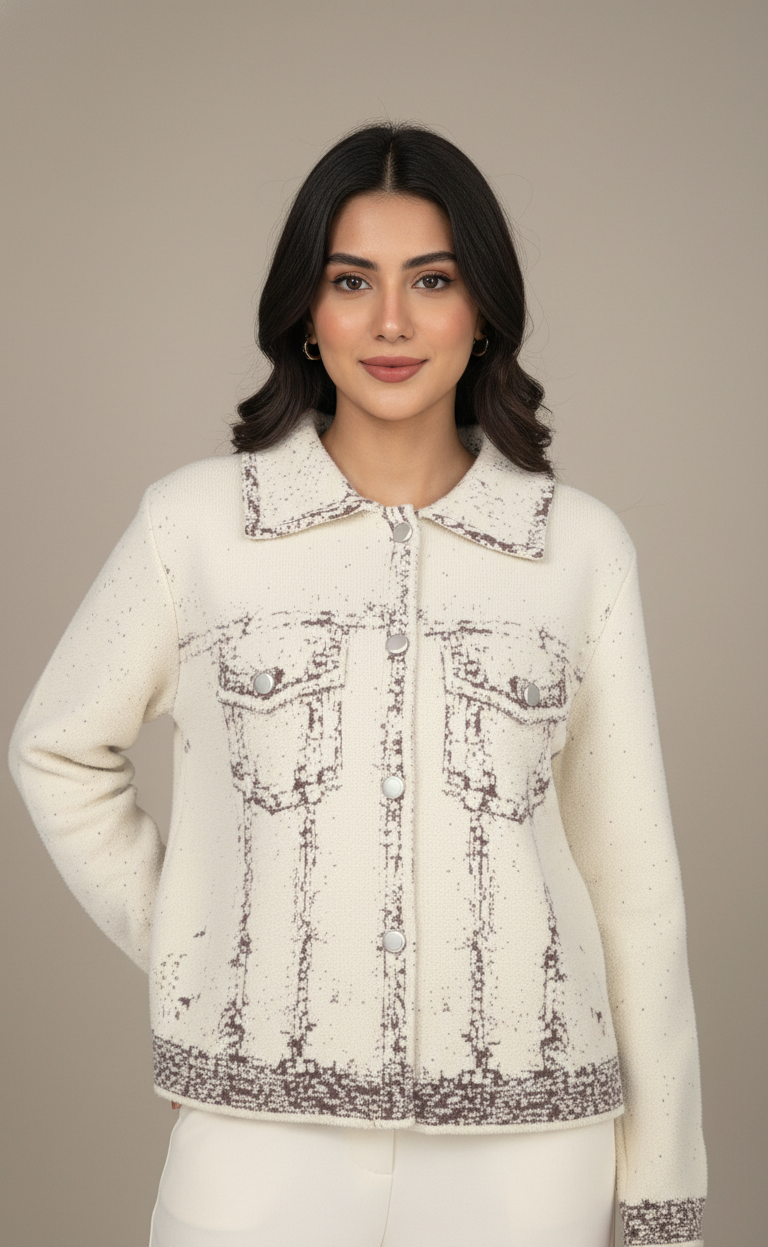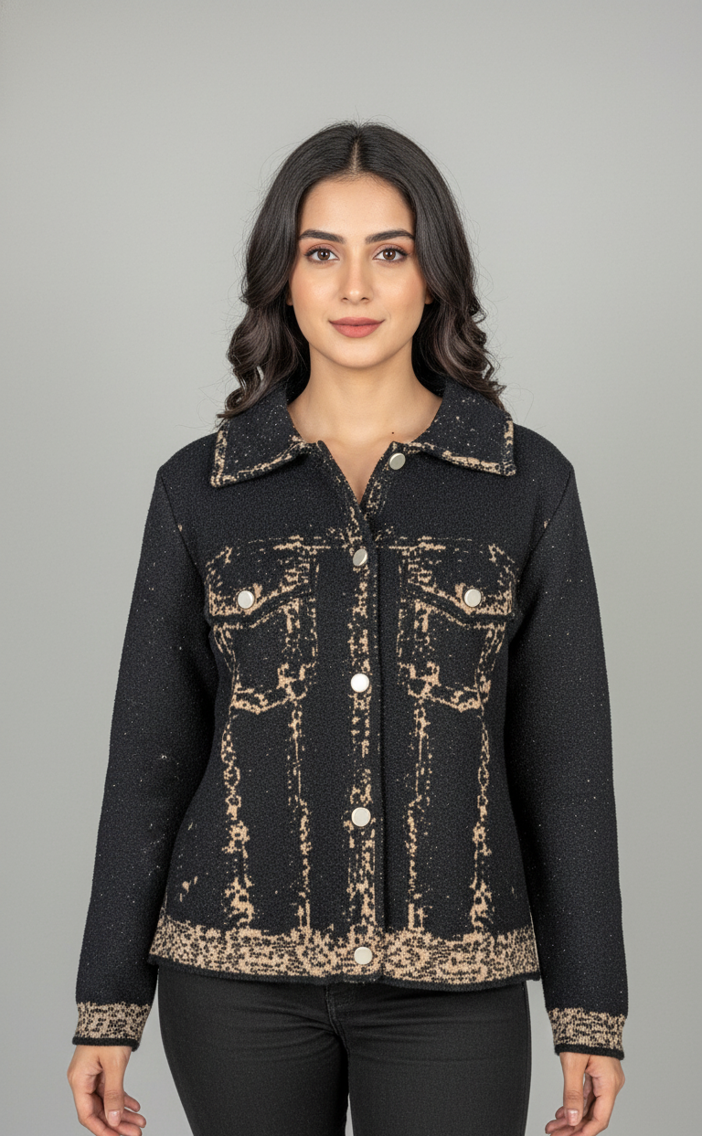Inject an edgy yet refined vibe into your look with our unique distressed knit jacket. Mimicking classic denim, this piece offers a contemporary twist while providing the comfort of soft knitwear. Made with high-quality yarn, this distinctive jacket is imported from Turkey.