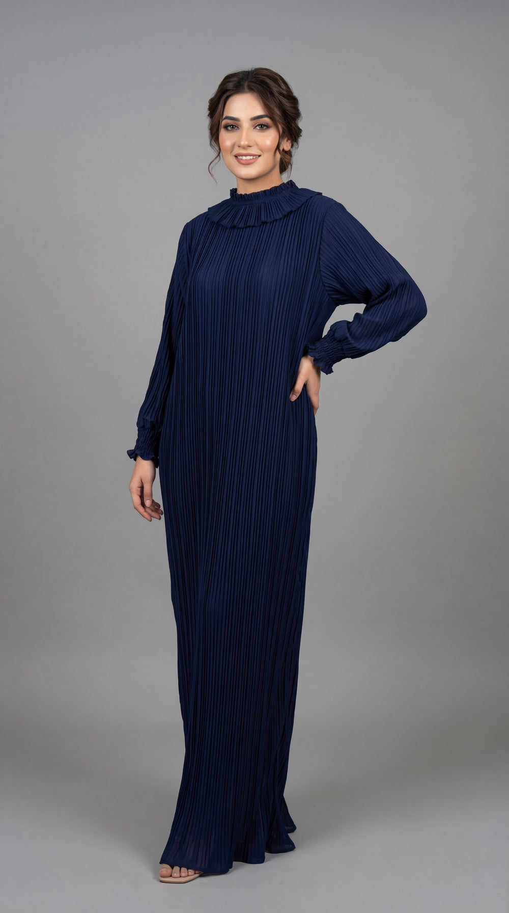 Navy Plissé Maxi Dress Elevate your wardrobe with this sophisticated navy plissé maxi dress, crafted from premium quality fabric that drapes beautifully. The intricate plissé pleating creates elegant movement and dimension, flattering your silhouette with every step. Constructed from durable, high-quality material designed to maintain its shape and structure through regular wear. The dress features a timeless navy hue that pairs effortlessly with any occasion, from formal events to refined casual settings. Care Instructions: Machine wash in cold water on a gentle cycle. Turn inside out to protect the plissé detailing. Use mild detergent and avoid bleach. Lay flat to dry to preserve the pleating and prevent wrinkles. Do not tumble dry. For best results, iron on low heat if needed, or steam gently to refresh the pleats.